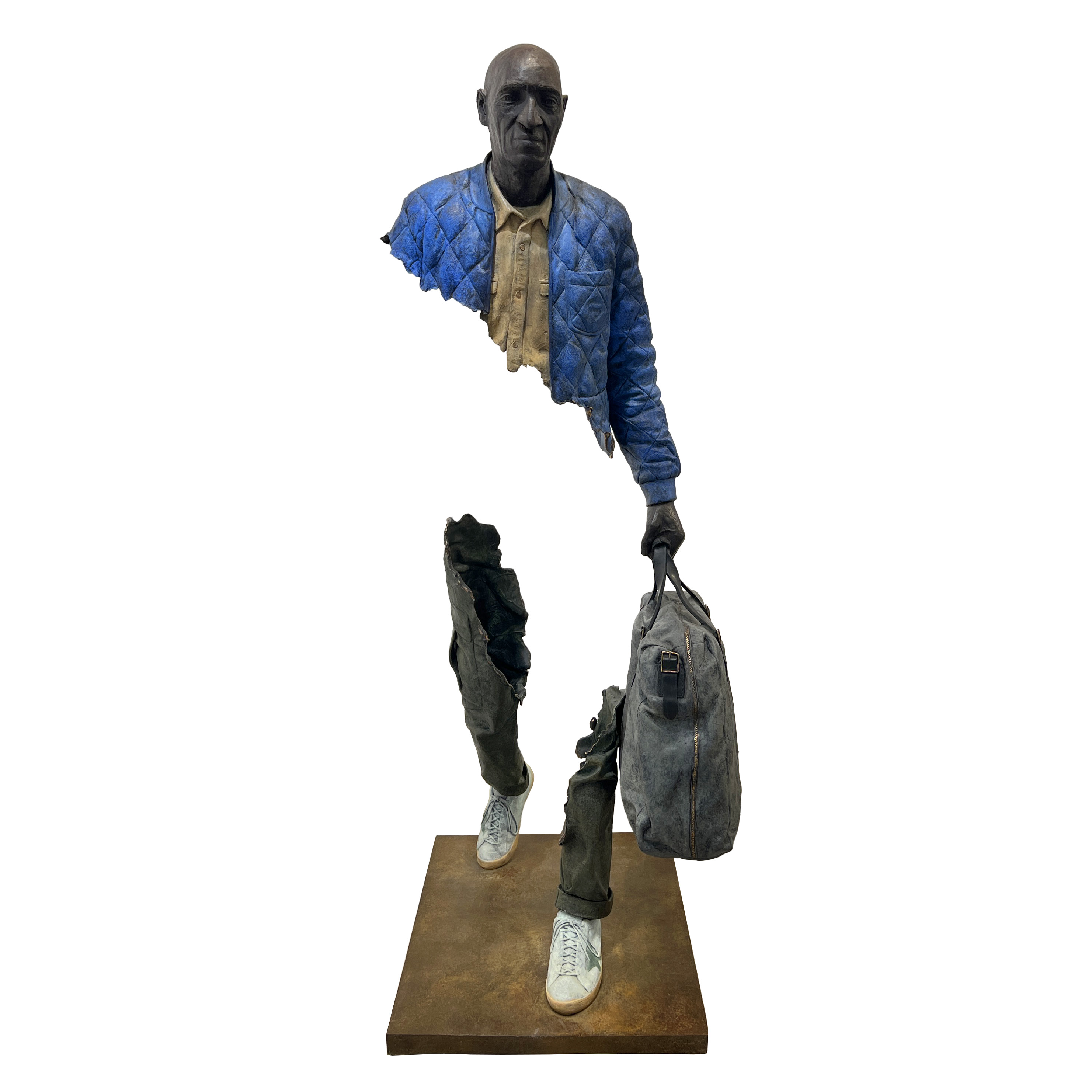 Claude – George Floyd est une sculpture originale en bronze de Bruno Catalano, issue de sa célèbre série Les Voyageurs. Cette œuvre emblématique, en duo, représente deux figures humaines en mouvement, valise à la main, dont une partie du corps est volontairement absente – une rupture dans la matière devenue la signature internationale de l’artiste. À travers cette absence sculptée, Bruno Catalano explore les thèmes du voyage, de l’identité et du déracinement. L’équilibre spectaculaire de la sculpture, malgré le vide central, témoigne de la maîtrise technique exceptionnelle de l’artiste.
