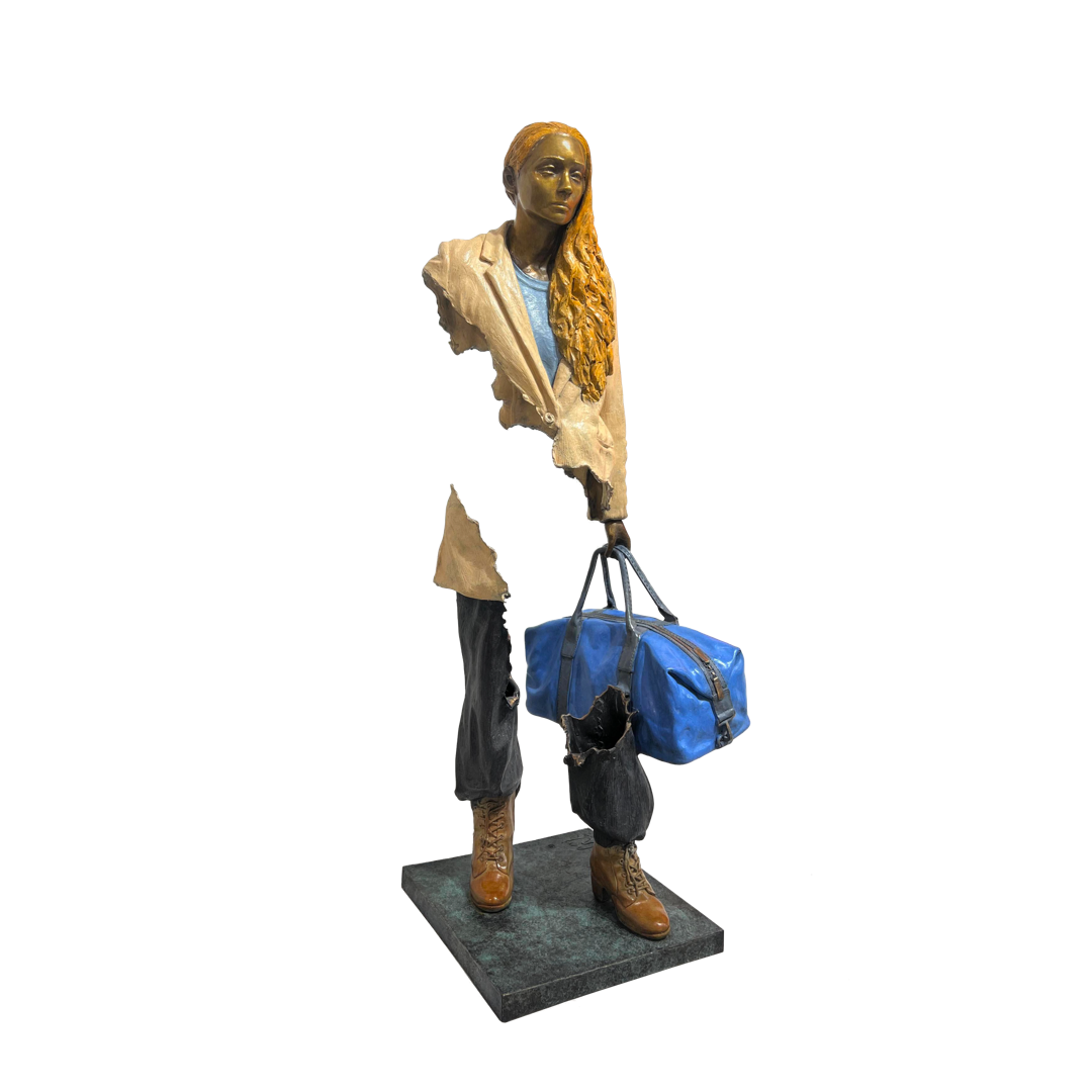 Lauralou est une sculpture originale en bronze de Bruno Catalano, issue de sa célèbre série Les Voyageurs. Cette œuvre emblématique, représente une figure humaine en mouvement, valise à la main, dont une partie du corps est volontairement absente – une rupture dans la matière devenue la signature internationale de l’artiste. À travers cette absence sculptée, Bruno Catalano explore les thèmes du voyage, de l’identité et du déracinement. L’équilibre spectaculaire de la sculpture, malgré le vide central, témoigne de la maîtrise technique exceptionnelle de l’artiste.